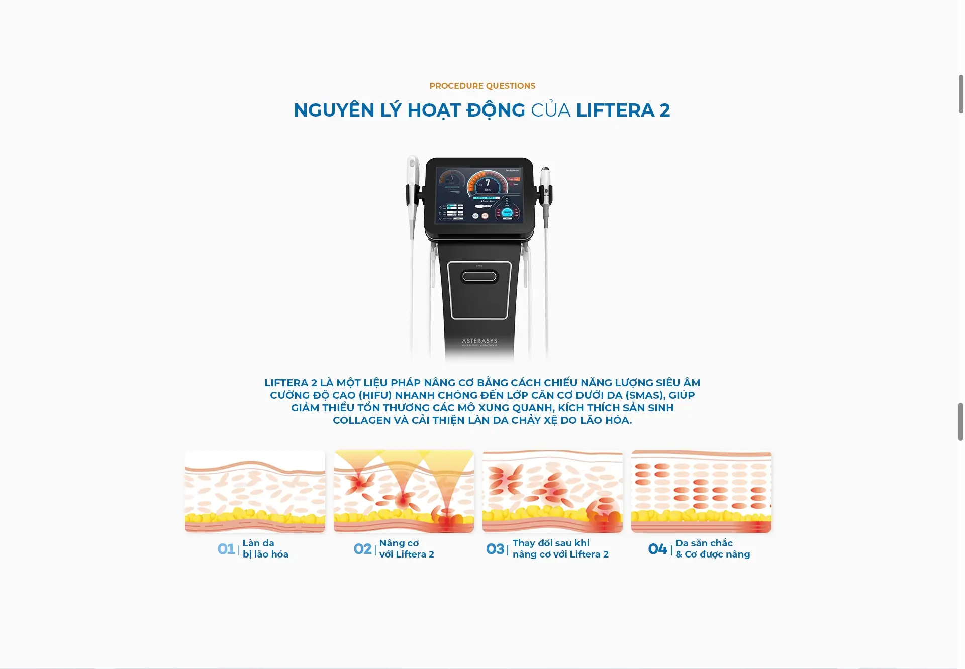 Năng lượng HIFU của Liftera 2 đi qua bề mặt da, truyền đến lớp cân cơ (SMAS) và mô cơ – nơi chứa Collagen, giúp kích thích sản sinh Collagen mà không gây tổn thương mô xung quanh, từ đó cải thiện tình trạng da chùng nhão do lão hóa.