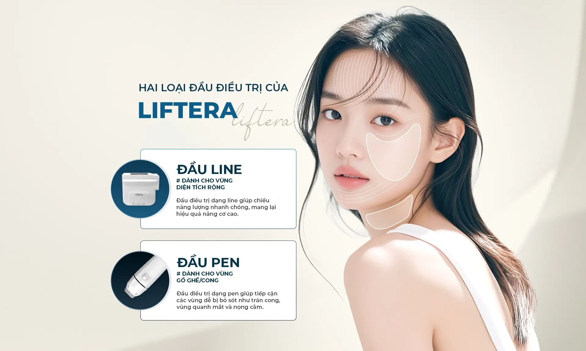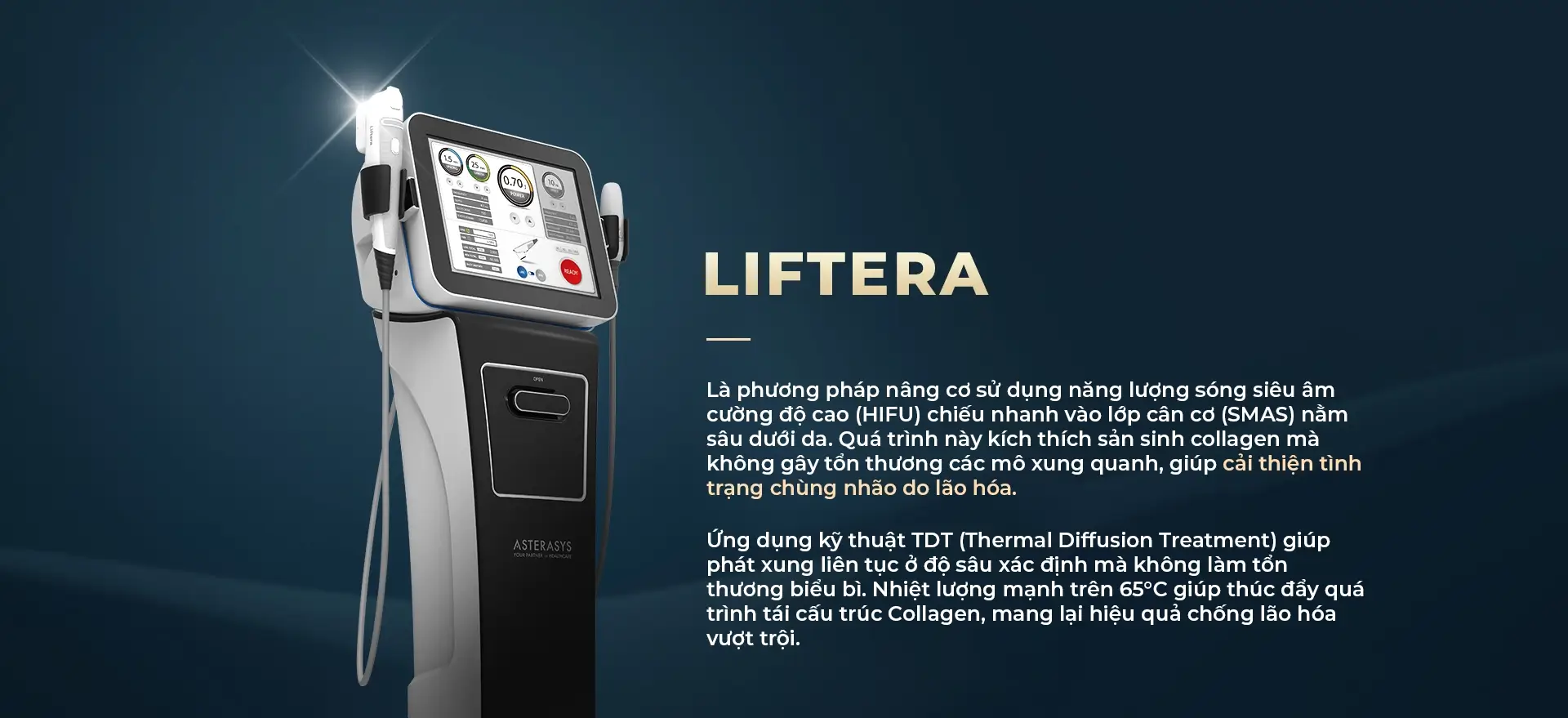 Năng lượng HIFU của Liftera 2 đi qua bề mặt da, truyền đến lớp cân cơ (SMAS) và mô cơ – nơi chứa Collagen, giúp kích thích sản sinh Collagen mà không gây tổn thương mô xung quanh, từ đó cải thiện tình trạng da chùng nhão do lão hóa.