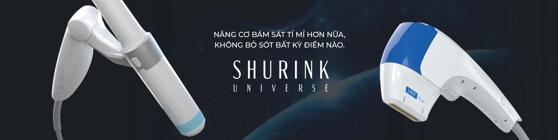 Shurink Universe là thiết bị nâng cơ sử dụng sóng siêu âm hội tụ cường độ cao (HIFU). Đây là thế hệ thứ 2 của dòng máy Shurink, giúp hội tụ năng lượng vào lớp cân cơ (SMAS) mà gần như không gây tổn thương bề mặt da, kích thích tái tạo Collagen và co rút các mô chảy xệ, giúp cải thiện độ đàn hồi toàn diện.
