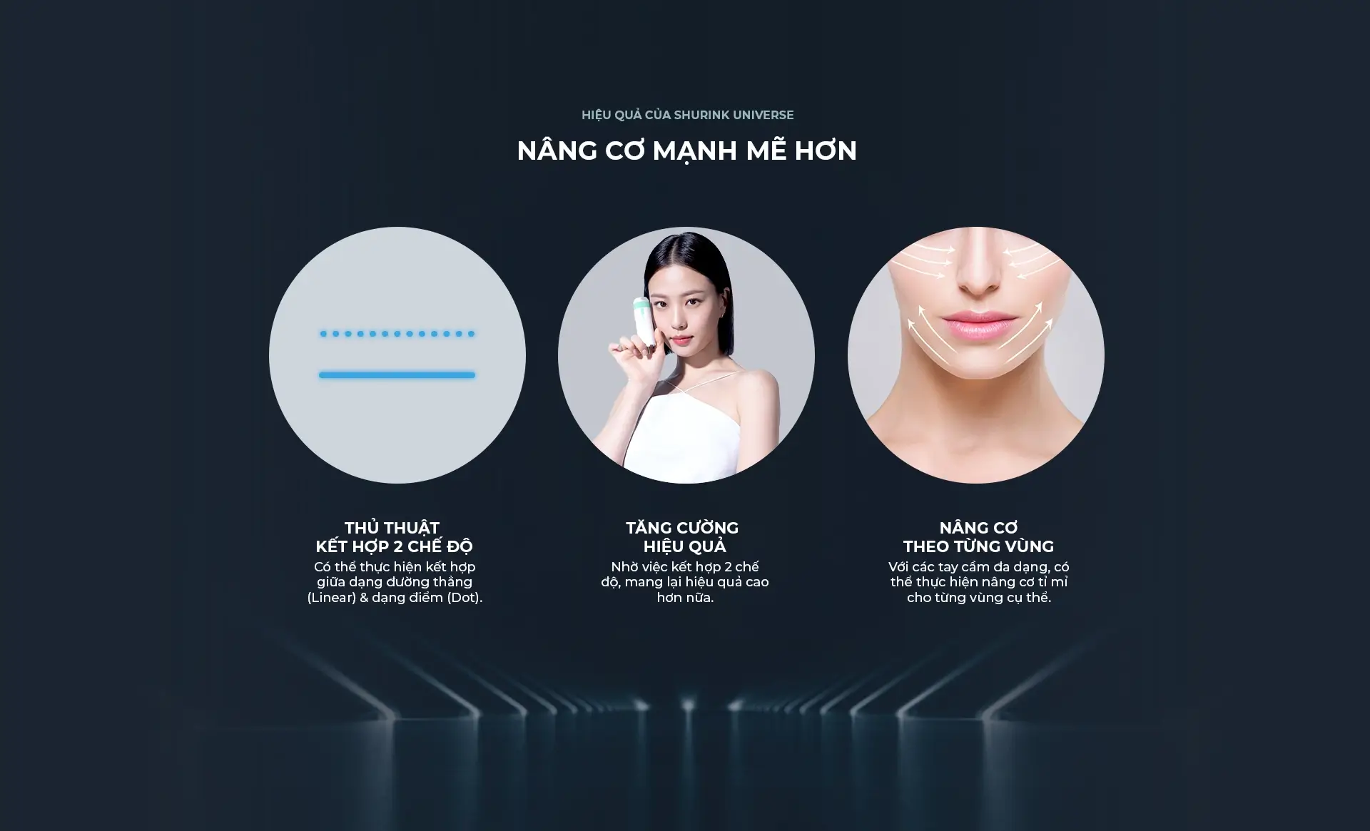 Shringk Universe có lợi thế là có thể truyền năng lượng một cách tỉ mỉ cho cả đường viền hàm, má, xương gò má cũng như các vùng cong hay quanh mắt nhờ tay cầm loại bút Ultra Booster, giúp nâng cơ kỹ lưỡng, và với hai chế độ siêu âm mạnh, năng lượng siêu âm được truyền một cách chi tiết hơn.