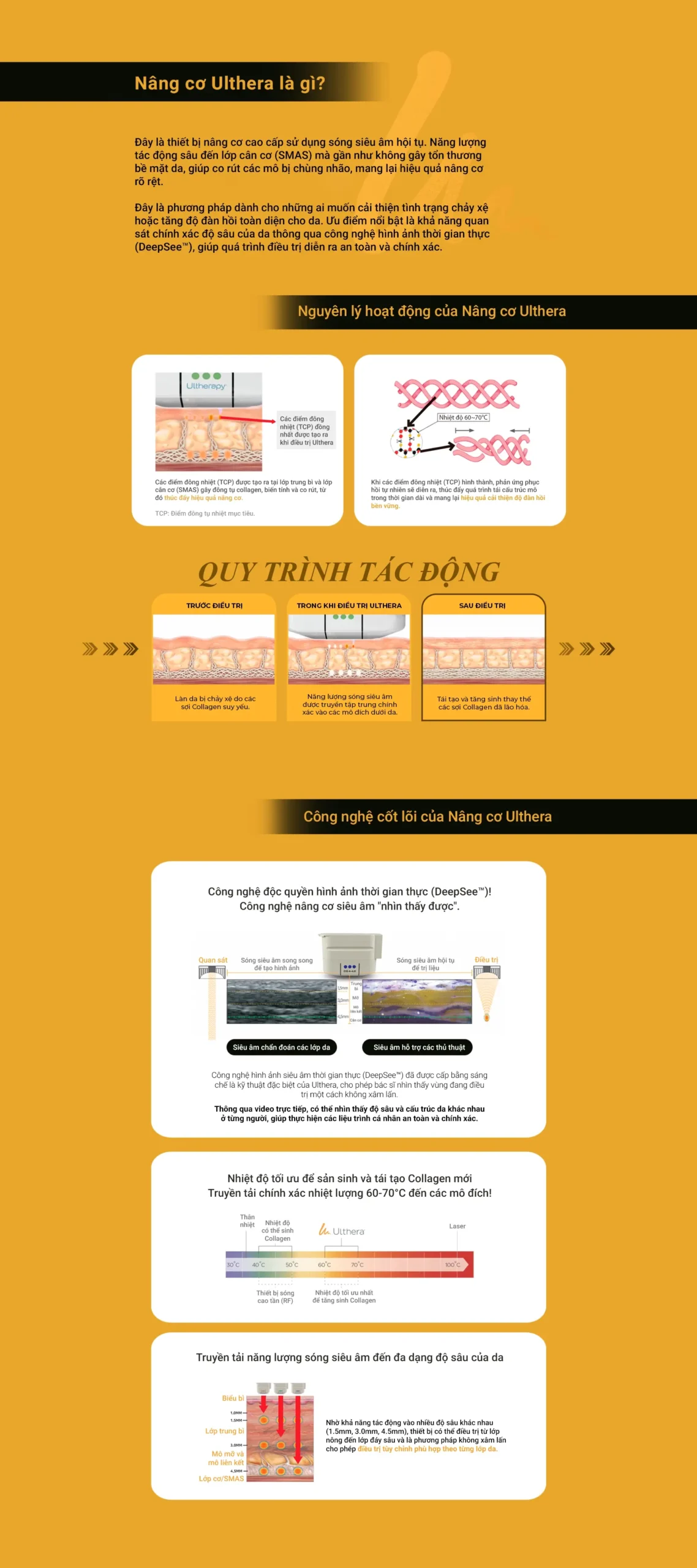 Là thiết bị nâng cơ cao cấp sử dụng sóng siêu âm hội tụ, đưa năng lượng tập trung vào lớp cân cơ (SMAS) mà không gây tổn thương bề mặt da, giúp co rút các mô lỏng lẻo và mang lại hiệu quả nâng cơ rõ rệt.